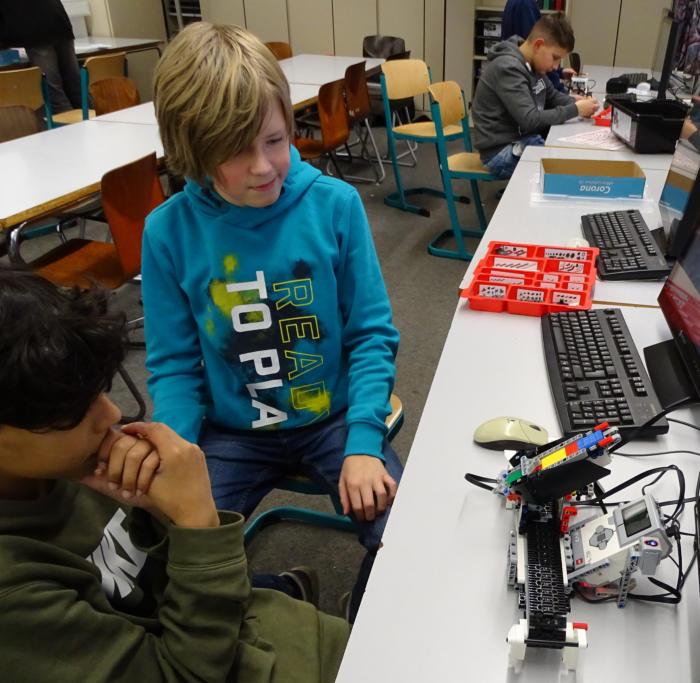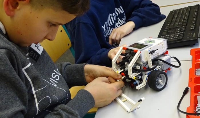 Aktivitäts-/ Arbeitsbericht Aktionsnachmittag im Programm ERASMUS+  Donnerstag, 09. 01. 2020, 14:00 - 16:00, Raum 52 Teilnehmer*innen: Ti, Ma, Se, Vi, Ad, Lu, Ak, Ag, LM, Dz, Vo Organisation - Was bedeutet Verlässlichkeit? - Abgabe Arbeitsblatt Exkursion Miniatur-Wunderland - Berichte an Vo zum Status der Arbeit seit 19. Dez. Fortsetzung der Arbeiten vom Dezember 2019 - Farbsortierer montieren (Ti, Ma, Ak, Ag)    Programm testen und studieren (Ti, Ma)    Füllen/ Erkennen der Farben; Sortieren gemäß Array - RoboterFahrzeug als FarbTransporter    (Sensor umsetzen, Bügel montieren) (Vi, Ad) - FarbTransporter (Programmieren ohne ARRAYS!), (Se, Lu) Bericht von Vo zu assoziierten Teilnehmer*innen: - Variety, Trikala GR: Meldung erwartet - Thunderbird01, Nairobi KE: Problem mit MAC nach   Update auf Catalina - Zorro, Rouen FR: steigt neu ein - LeSo, Meine DE: Hardware-Warteschleife - Northpole19, Lübeck DE: LineFollower mit Hindernis - Lionteam, Fockbek DE: Hello Family in Hebelsteuerung,    Hardware-Warteschleife - Arrow, Kaunas LT: Robotic-Kurs Lehrkraft Dz betreut die Teams. LM assistiert mit Kamera. Vo assistiert bei Prog.) Feedback Teilnehmer: Feedback Lehrkräfte: Die Schüler arbeiten im Ferienmodus, gleichwohl erfolgreich. Ma und Ti montieren den Farbsortierer im Original. Sie entdecken Ungenauigkeiten im Programmlauf. Farben werden nicht richtig erkannt. Es gilt zu untersuchen, ob die Leuchten im Raum den Sensor irritieren. Ag und Ak montieren den Farbsortierer im Original. Sie entdecken beim Programm-Probelauf Hardwareprobleme. Ein verklemmter Baustein kann den Programmlauf irritieren. Se und Vi modifizieren das RobotCar zu einem Farbshifter, welcher Kisten - je nach Farbe - an definierte Plätze bringt. Hier folgen die Programmprobeläufe und deren Modifikation beim nächsten Treffen. Kompetenzgerangel um Hardwaregestaltung und Softwarenutzung legt eine rotierende Besetzung der Teams, zumindest aber je einen zweiten PC nahe.